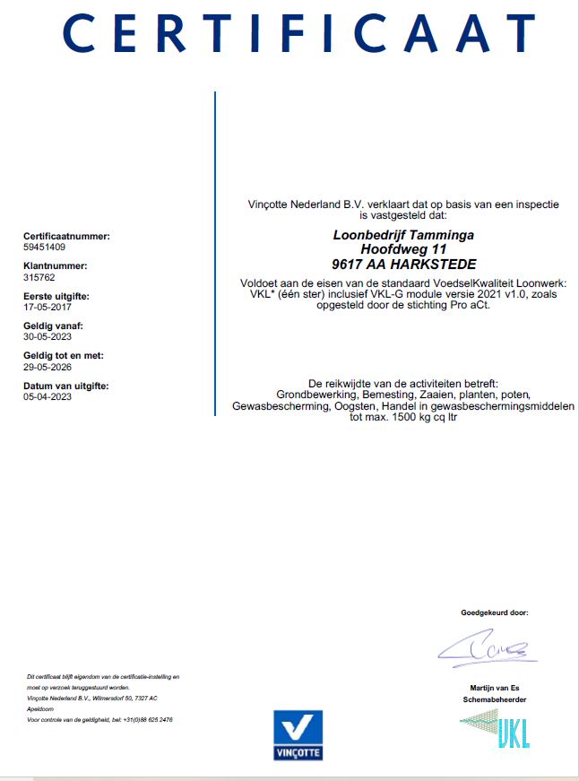 U kunt het certificaat ook downloaden als PDF: Certificaat Voedsel Kwaliteit Loonwerk VKL Tamminga